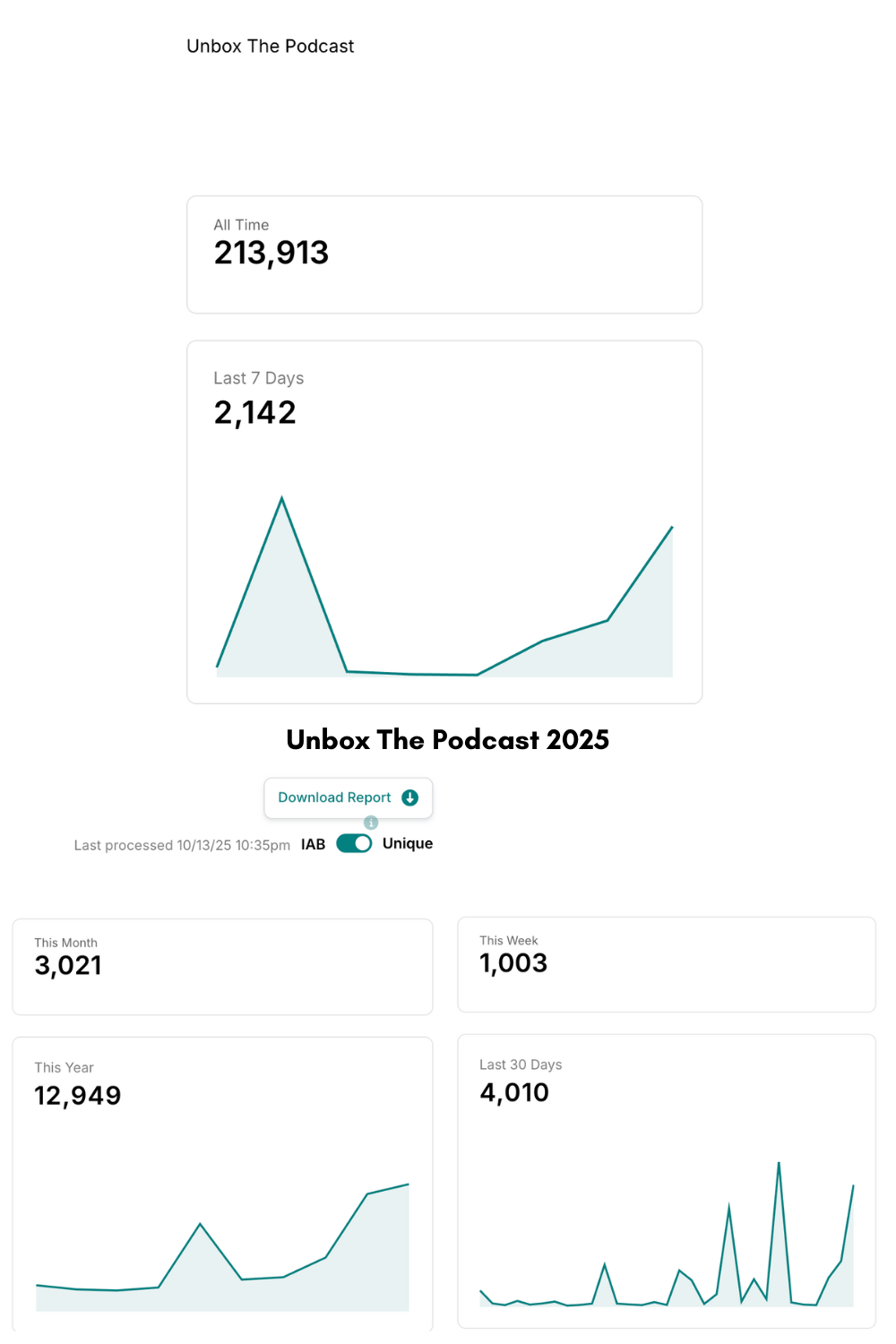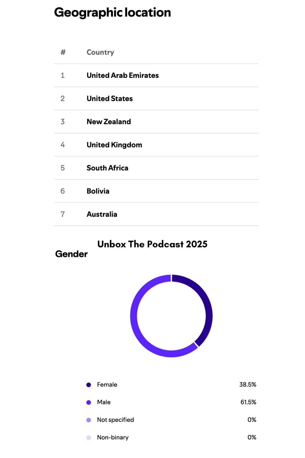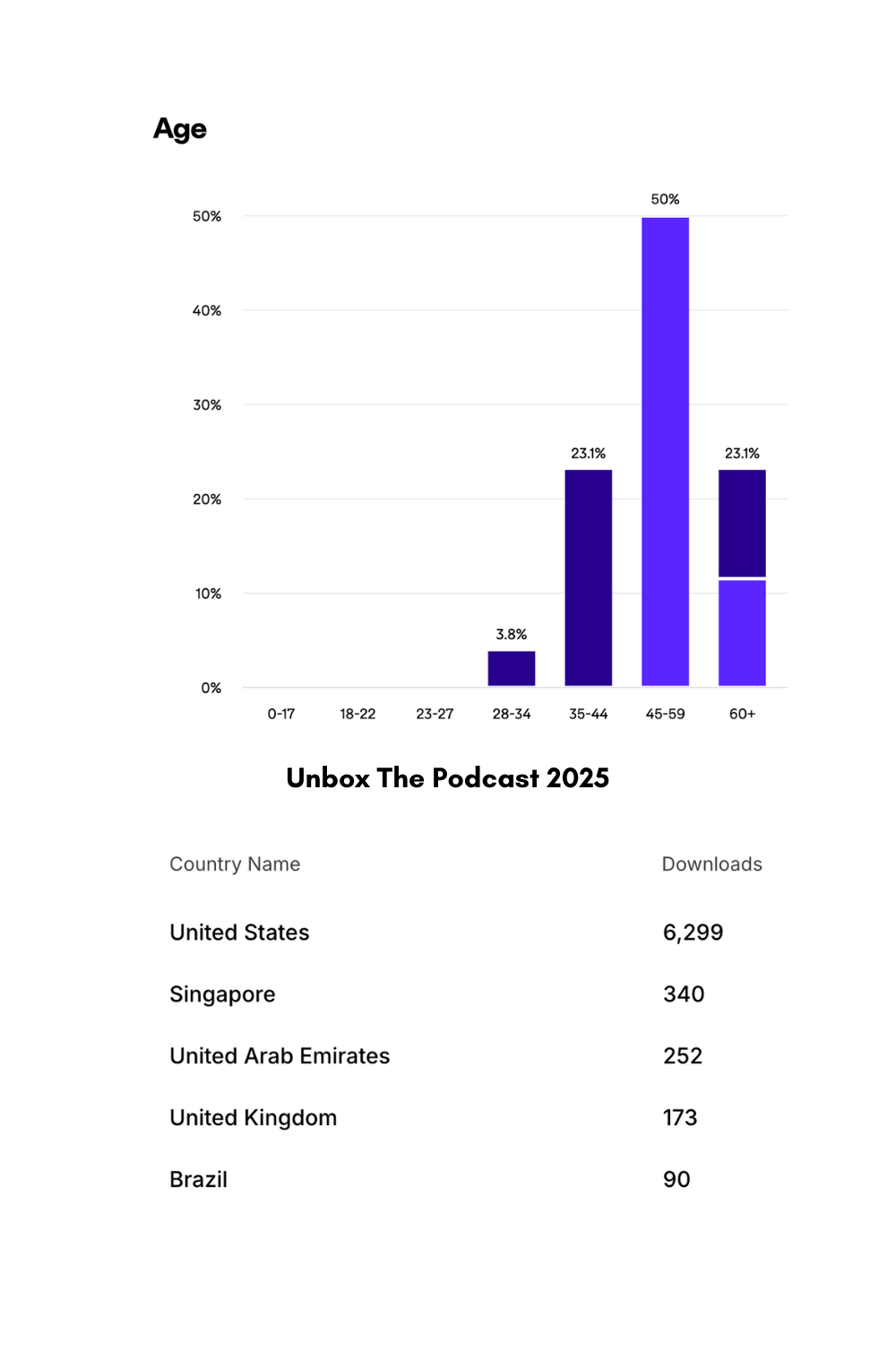 Twenty years later, Unbox The Podcast has evolved from a few hundred curious listeners into a global community. Listeners now tune in from more than 54 countries, creating over 45,000 IAB-certified downloads and more than 200,000 unique listens. Those aren’t just numbers. They’re stories. They represent people listening with intent, reflecting, growing, and recognising themselves in these conversations.